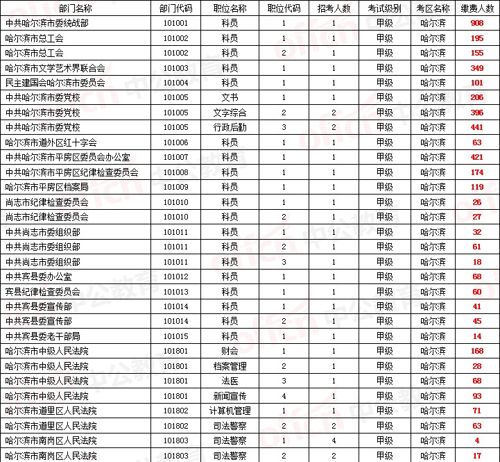中公網(wǎng)校為參加2014年黑龍江省公務(wù)員考試的考生整理截止至5月19日下午15點(diǎn)的哈爾濱考區(qū)繳費(fèi)人數(shù),由于報(bào)名網(wǎng)站報(bào)名情況每30分鐘統(tǒng)計(jì)一次,數(shù)據(jù)可能會(huì)有細(xì)微差異,所有數(shù)據(jù)僅供大家參考。