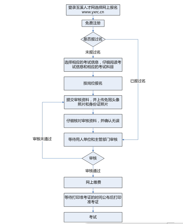 網絡報名的大致流程為:登錄玉溪人才網→網上報名入口→注冊→查看招聘崗位→按崗位報名并填寫報名資料→等待審核→審核通過→網上交費(注意查看交費狀態(tài),確認交費)→打印筆試準考證(打印時間在筆試公告內另行通知)→參加筆試。