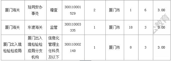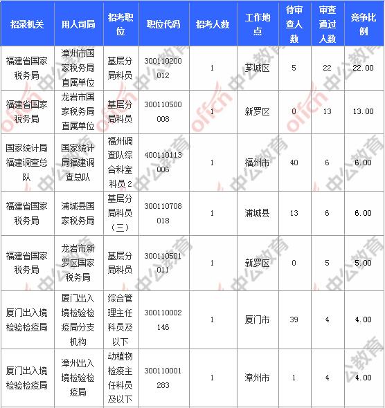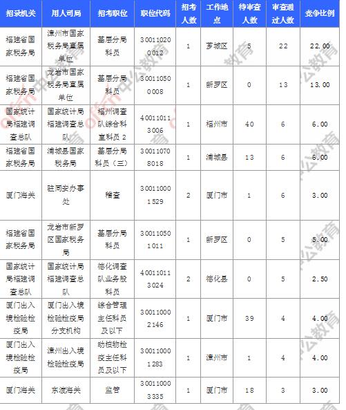 報名通過審核人數(shù)前十的職位主要集中在福建省國家稅務(wù)局、國家統(tǒng)計局福建調(diào)查總隊、廈門海關(guān)等部門,具體信息如下: