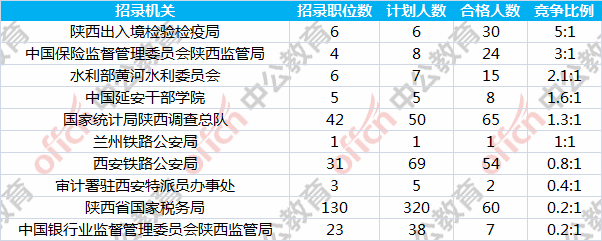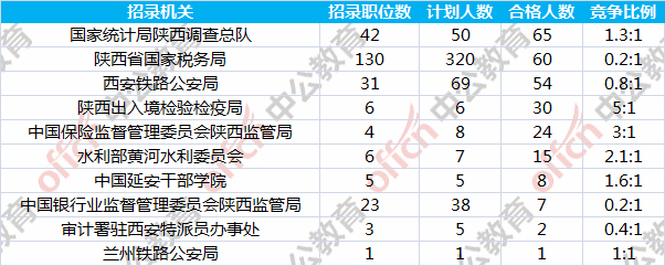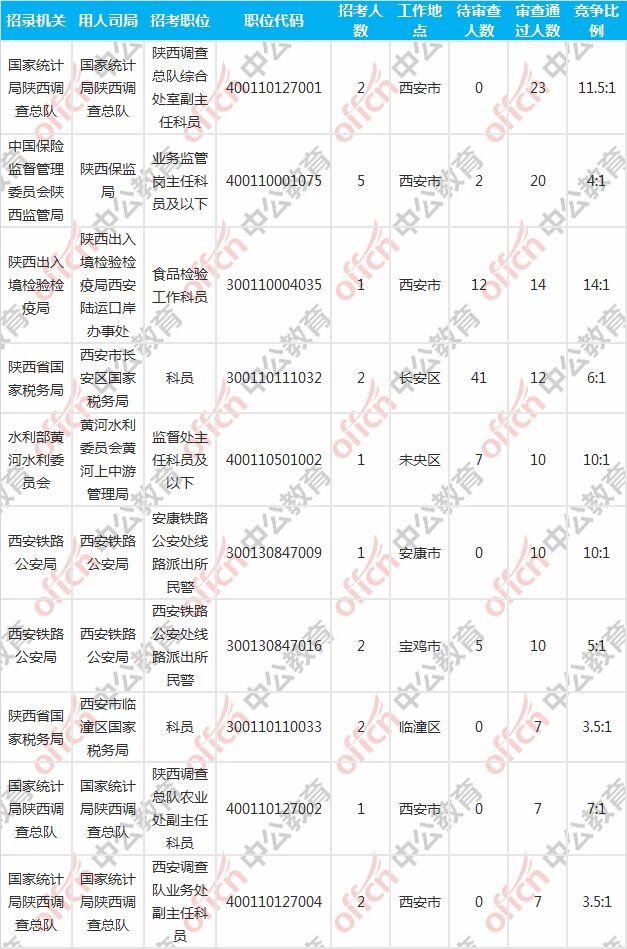 報名通過審核人數(shù)前十的職位主要集中在陜西出入境檢驗檢疫局、國家統(tǒng)計局陜西調(diào)查總隊、西安鐵路公安局等部門,具體信息如下: