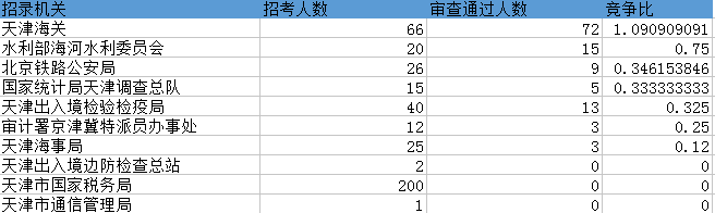 報名通過審核人數(shù)前十的職位主要集中在天津海關(guān)、水利部海河水利委員會等部門,具體信息如下:
