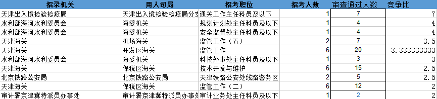 截止到30日18時,競爭比例的職位為天津出入境檢驗檢疫局的工作主任科員及以下,招錄1人,截止到30日18時通過人數(shù)為7人。