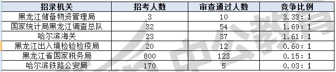 截止到30日18時(shí),通過(guò)審核人數(shù)前三位的部門依次是:黑龍江省國(guó)家稅務(wù)局、國(guó)家統(tǒng)計(jì)局黑龍江調(diào)查總隊(duì)、哈爾濱海關(guān),三部門通過(guò)審核總?cè)藬?shù)達(dá)214人,占通過(guò)審核總?cè)藬?shù)的88.8%。