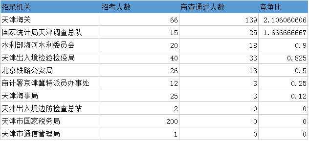 截止到31日9時(shí),競(jìng)爭(zhēng)比例的職位為天津海關(guān)的監(jiān)管工作(五),招錄1人,截止到31日9時(shí)通過(guò)人數(shù)為25人。