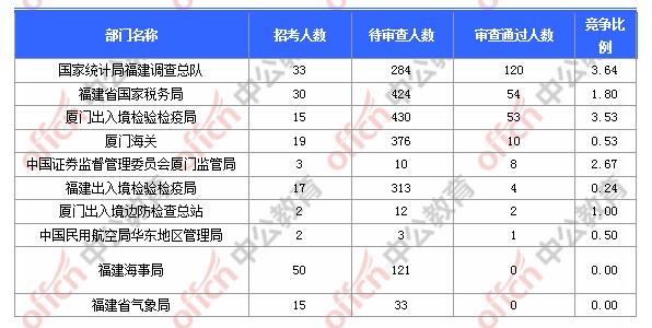 截止到31日9時,通過審核人數(shù)前三位的部門依次是:國家統(tǒng)計局福建調(diào)查總隊、福建省國家稅務(wù)局、廈門出入境檢驗檢疫局,三部門通過審核總?cè)藬?shù)達(dá)227人,占通過審核總?cè)藬?shù)的90%。