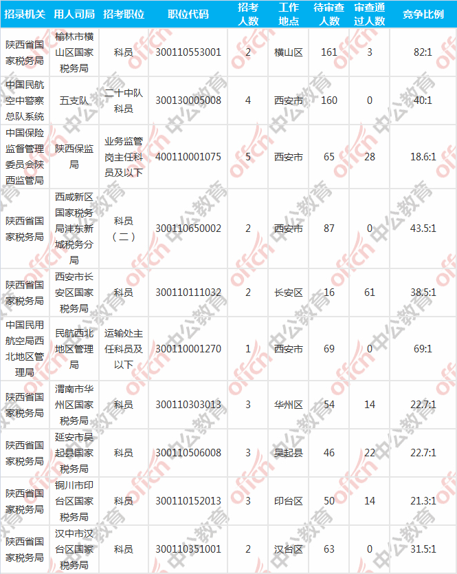 報名人數(shù)前十的職位主要集中在陜西省國家稅務局、中國民航空中警察總隊系統(tǒng)、中國保險監(jiān)督管理委員會陜西監(jiān)管局等部門,具體信息如下: