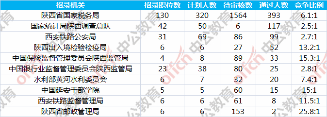 截至到31日9時,通過審核人數(shù)前三位的部門依次是:陜西省國家稅務局、國家統(tǒng)計局陜西調(diào)查總隊、西安鐵路公安局,三部門通過審核總人數(shù)達609人,占通過審核總人數(shù)的79.4%。