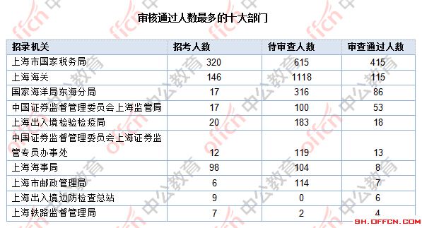 截止到31日10時,通過審核人數(shù)前三位的部門依次是:上海市國家稅務(wù)局,上海海關(guān),國家海洋局東海分局,三部門通過審核總?cè)藬?shù)達(dá)616人,占通過審核總?cè)藬?shù)的83.58%。