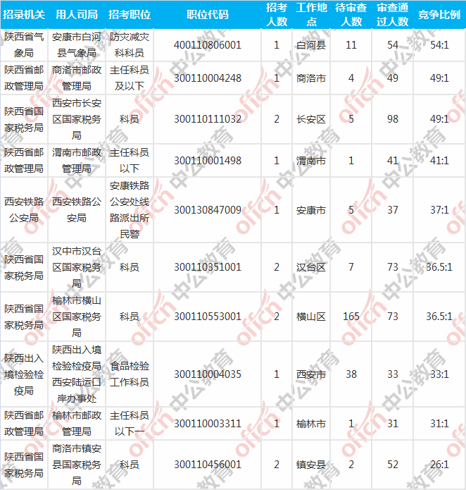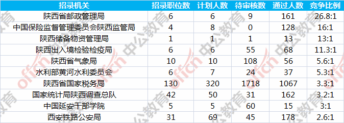 報(bào)名人數(shù)前十的職位主要集中在陜西省國(guó)家稅務(wù)局、西安鐵路監(jiān)督管理局、中國(guó)保險(xiǎn)監(jiān)督管理委員會(huì)陜西監(jiān)管局等部門,具體信息如下: