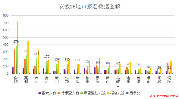 截止到31日18時,安徽地區(qū)16個地市通過審核的人數(shù)如下,其中合肥市通過審核人數(shù)最多;為379人,銅陵市通過審核人數(shù)最少,為25人。合肥市的競爭最激烈,為4.08:1。