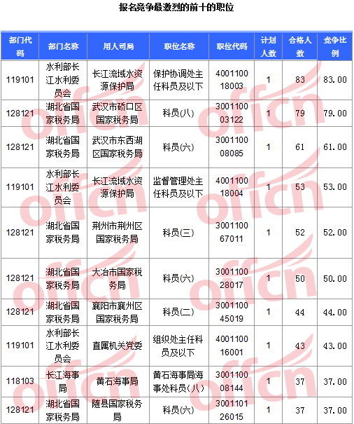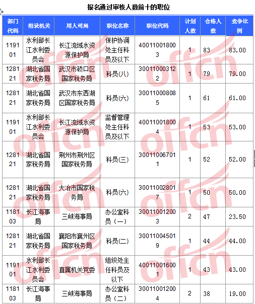 報(bào)名通過審核人數(shù)前十的職位主要集中在水利部長江水利委員會(huì)、湖北省國家稅務(wù)局、長江海事局等部門,具體信息如下: