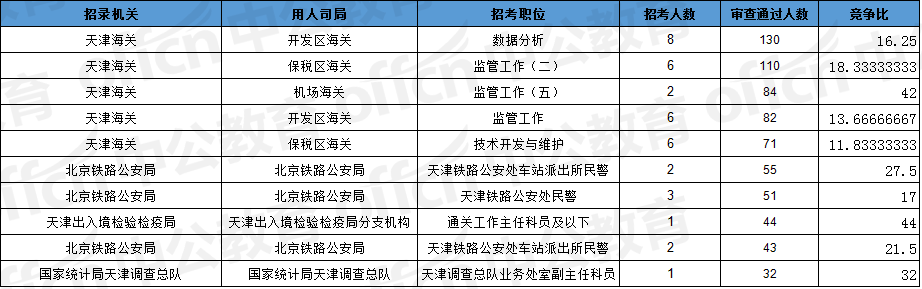 報(bào)名通過審核人數(shù)前十的職位主要集中在天津海關(guān)、北京鐵路公安局、天津出入境檢驗(yàn)檢疫局等部門,具體信息如下:
