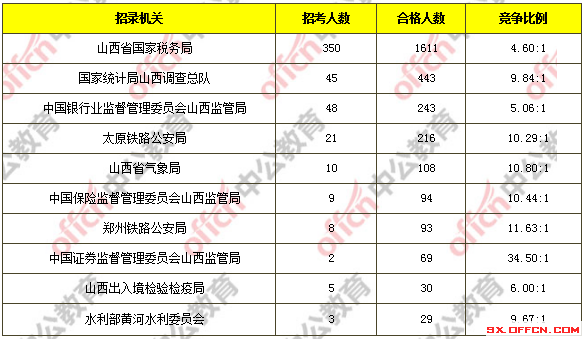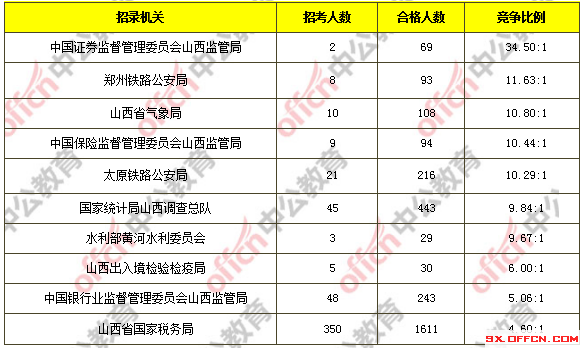 截至11月1日16時,據(jù)中公網(wǎng)校統(tǒng)計,國考職位中工作地點(diǎn)在山西的職位通過審核總?cè)藬?shù)為3009人,和去年同期相比合格人數(shù)減少了309人,截止目前共有44個職位無人報考,平均競爭比例為5.67:1,和去年同期競爭比基本持平。