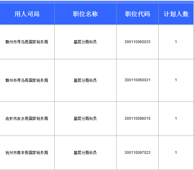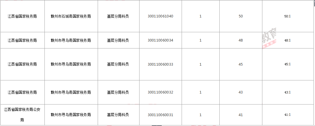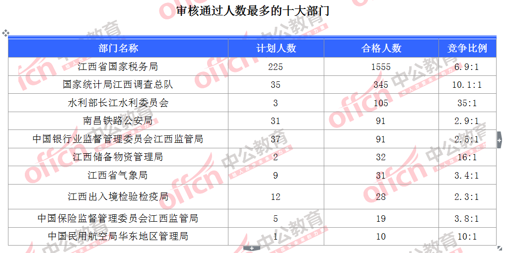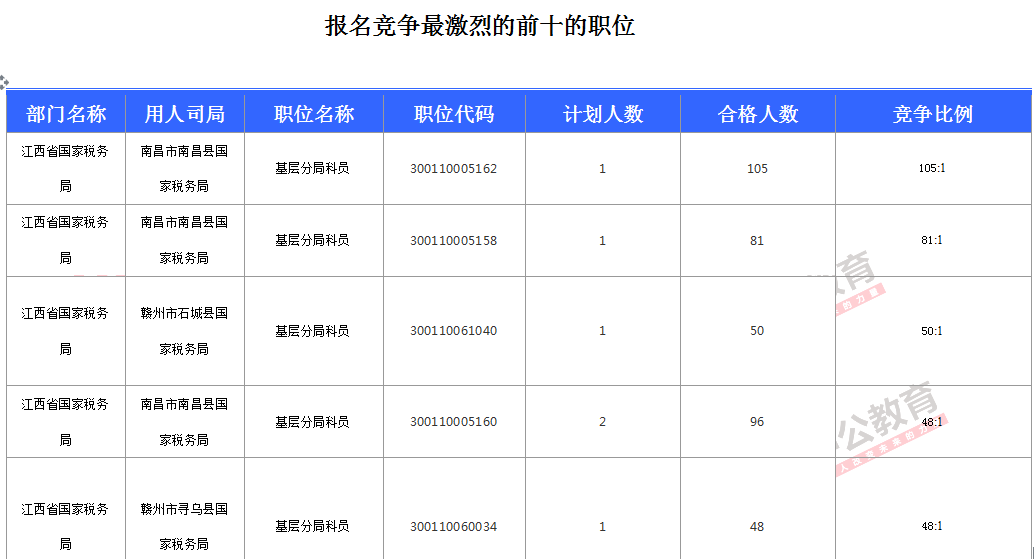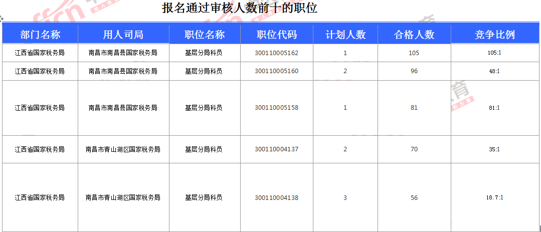 報(bào)名通過(guò)審核人數(shù)前十的職位主要集中在江西省國(guó)家稅務(wù)局這個(gè)部門(mén),具體信息如下: