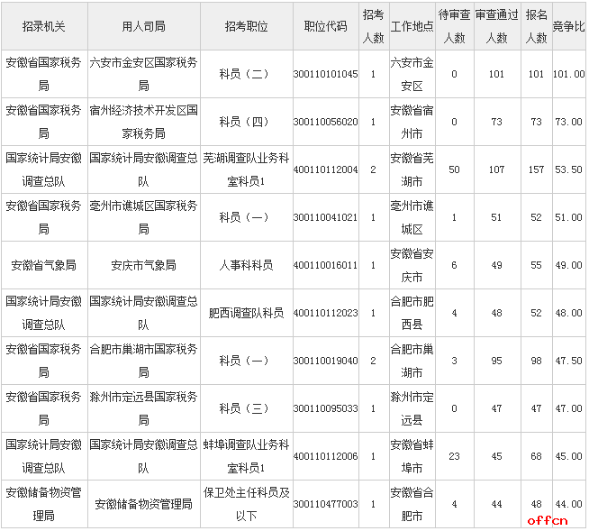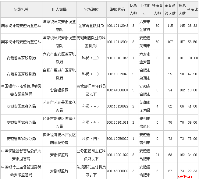 報(bào)名通過審核人數(shù)前十的職位主要集中在國家統(tǒng)計(jì)局、國稅局、安徽銀監(jiān)局等部門,具體信息如下:
