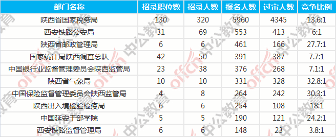 截至到2日16時,通過審核人數(shù)前三位的部門依次是:陜西省國家稅務(wù)局、西安鐵路公安局、國家統(tǒng)計局陜西調(diào)查總隊,三部門通過審核總?cè)藬?shù)達5145人,占通過審核總?cè)藬?shù)的77.4%。