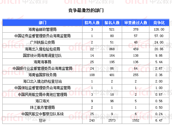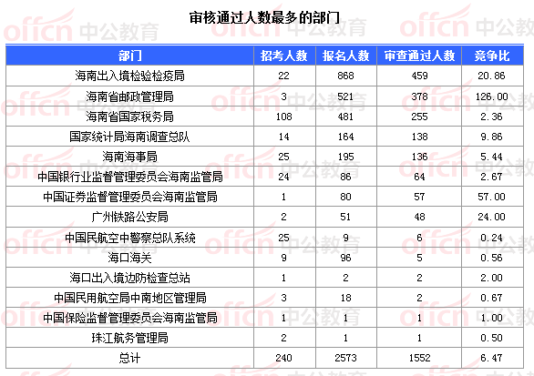 為幫助廣大考生更清晰的了解今日報名情況,中公網(wǎng)校整理了審核通過人數(shù)的部門以及競爭比例最激烈的部門,供廣大考生參考: