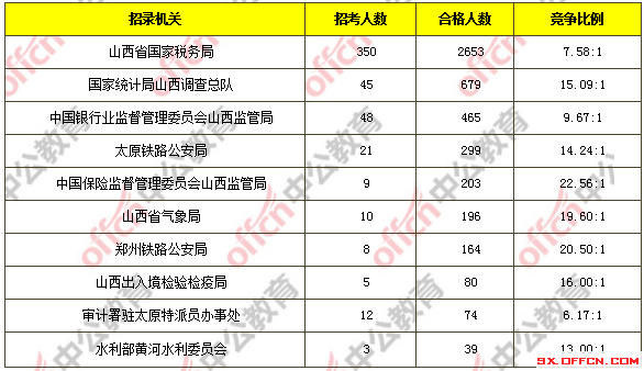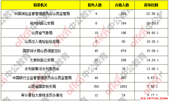 為幫助廣大考生更清晰的了解今日?qǐng)?bào)名情況,山西中公教育整理了審核通過(guò)人數(shù)前十位的部門(mén)以及競(jìng)爭(zhēng)比例最激烈的十大部門(mén),供廣大考生參考: