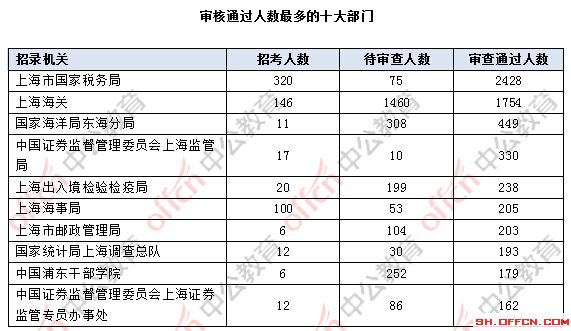 截止到2日16時,通過審核人數(shù)前三位的部門依次是:上海市國家稅務局,上海海關,國家海洋局東海分局,三部門通過審核總?cè)藬?shù)達4631人,占通過審核總?cè)藬?shù)的70.63%。