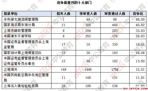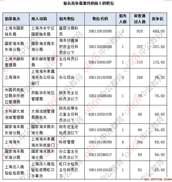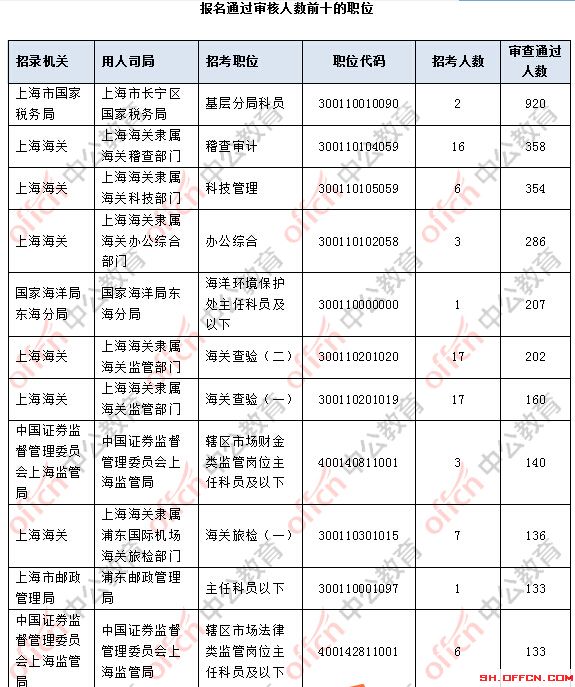 為幫助廣大考生更清晰的了解今日報名情況,上海中公教育整理了審核通過人數(shù)前十位的部門以及競爭比例最激烈的十大部門,供廣大考生參考: