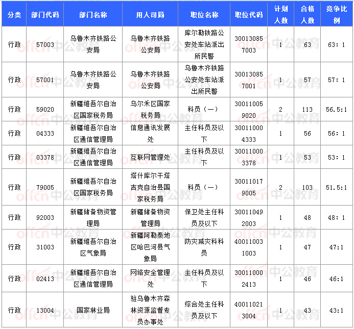 截止到11月2日16時,競爭比例的職位為烏魯木齊鐵路公安局庫爾勒鐵路公安處車站派出所民警一職,招錄1人,截止到2日16時通過人數(shù)為63人,尚有11人待審,再創(chuàng)新疆競爭比例新高!