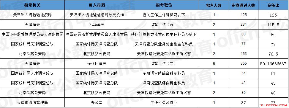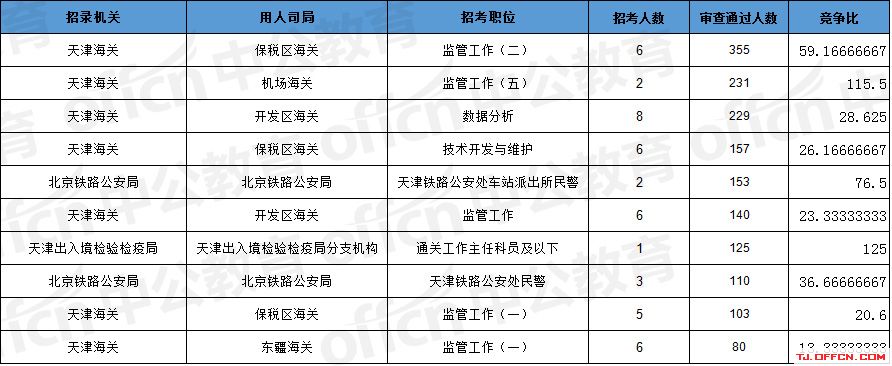 報名通過審核人數(shù)前十的職位主要集中在天津海關(guān)、北京鐵路公安局、天津出入境檢驗檢疫局等部門,具體信息如下: