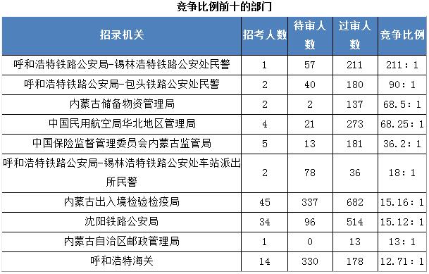 競(jìng)爭(zhēng)比例的部門(mén)為呼和浩特鐵路公安局-錫林浩特鐵路公安處民警,招錄1人,截至到2017年11月2日16時(shí),過(guò)審人數(shù)為211人,其次是包頭鐵庫(kù)公安處民警,招錄2人,過(guò)審人數(shù)為180人。