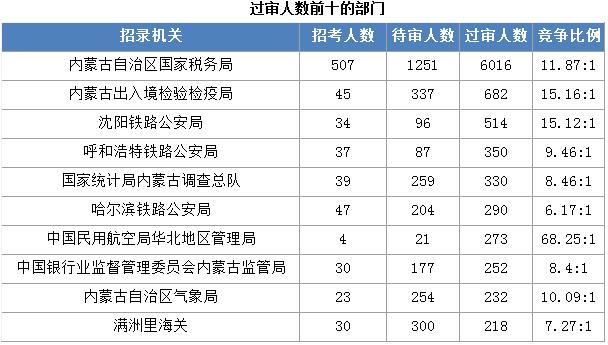 截止到2日16時(shí),通過(guò)審核人數(shù)前三位的部門(mén)依次是:內(nèi)蒙古自治區(qū)國(guó)家稅務(wù)局(過(guò)審6016人)、內(nèi)蒙古出入境檢驗(yàn)檢疫局(過(guò)審682人)、沈陽(yáng)鐵路公安局(過(guò)審514人),三部門(mén)通過(guò)審核總?cè)藬?shù)達(dá)7212人,占通過(guò)審核總?cè)藬?shù)的70.3%。