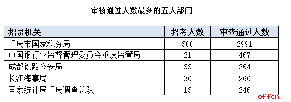 截止到3日16時,通過審核人數(shù)前三位的部門依次是:重慶市國家稅務局、中國銀行業(yè)監(jiān)督管理委員會重慶監(jiān)管局、成都鐵路公安局,三部門通過審核總?cè)藬?shù)達3722人,占通過審核總?cè)藬?shù)的81%。
