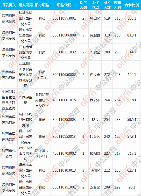 截至到3日16時,競爭比例的職位為陜西省榆林市橫山區(qū)國家稅務局科員一職,招錄2人,截至到3日16時報名人數為518人,通過審核人數為516人,競爭比例258:1!
