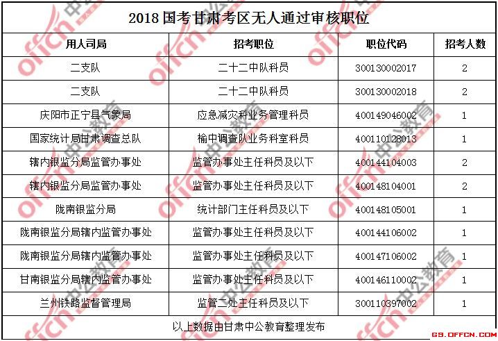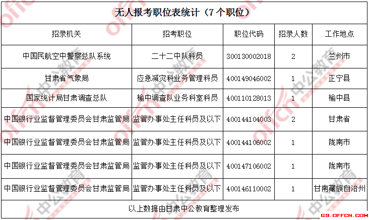 11月3日16時(shí),工作地點(diǎn)在甘肅的職位共有11個(gè)無人待審,占全部職位的5.02%,7個(gè)職位無人報(bào)考,占全部職位的3.2%。下面是無人待審及無人報(bào)報(bào)職位一覽表,中公網(wǎng)校專家建議廣大考生多關(guān)注一些較冷職位,避免激烈競爭,結(jié)合自身?xiàng)l件,找到屬于自己的職位。