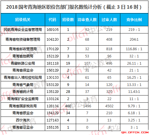 以下是3日16時各部門報名人數統(tǒng)計分析,其中中國民航青海安全監(jiān)督管理局、青海省物資儲備管理局、青海省郵政管理局等三個部門競爭最激烈,競爭比均超過116:1。