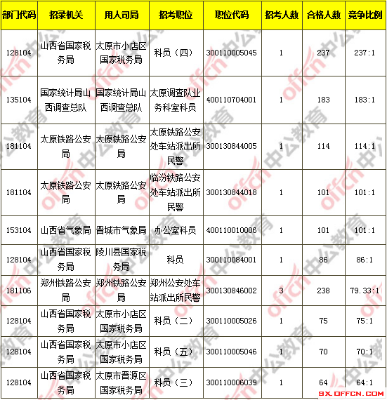 報名通過審核人數(shù)前十的職位主要集中在鄭州鐵路公安局、山西省國家稅務局、國家統(tǒng)計局山西調查總隊等部門,具體信息如下: