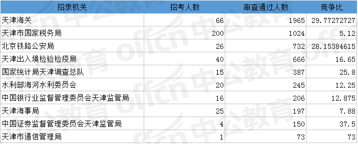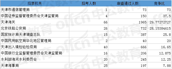 為幫助廣大考生更清晰的了解今日?qǐng)?bào)名情況,中公網(wǎng)校整理了審核通過人數(shù)前十位的部門以及競(jìng)爭(zhēng)比例最激烈的十大部門,供廣大考生參考: