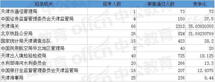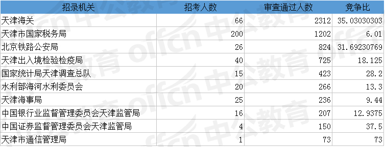 為幫助廣大考生更清晰的了解今日?qǐng)?bào)名情況,中公網(wǎng)校整理了審核通過人數(shù)前十位的部門以及競(jìng)爭(zhēng)比例最激烈的十大部門,供廣大考生參考: