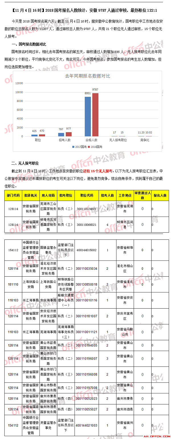 【11月4日16時】2018國考報名人數(shù)統(tǒng)計:安徽9787人通過審核,最熱職位122:1