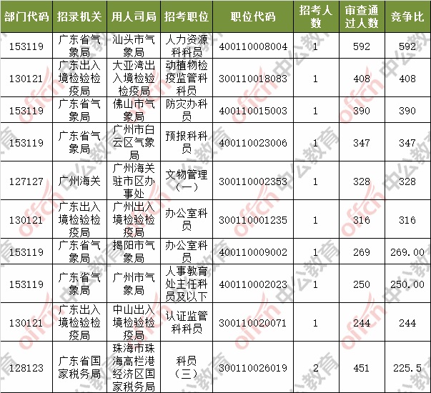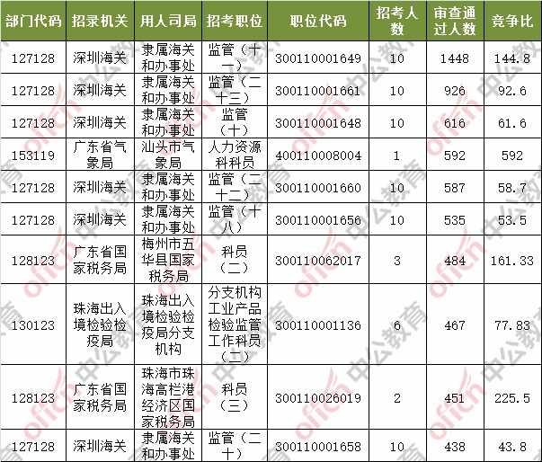 報名通過審核人數(shù)前十的職位主要集中在深圳海關、廣東省氣象局、廣東省國家稅務局等部門,具體信息如下: