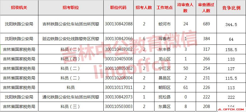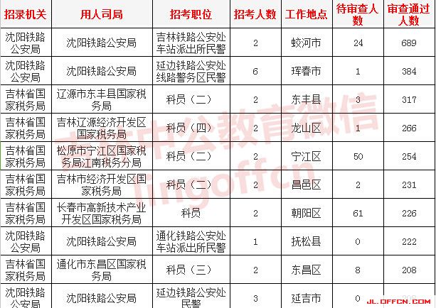 報(bào)名通過審核人數(shù)前十的職位主要集中在沈陽鐵路公安局、吉林國家稅務(wù)局、吉林出入境檢疫檢驗(yàn)局等部門,具體信息如下:
