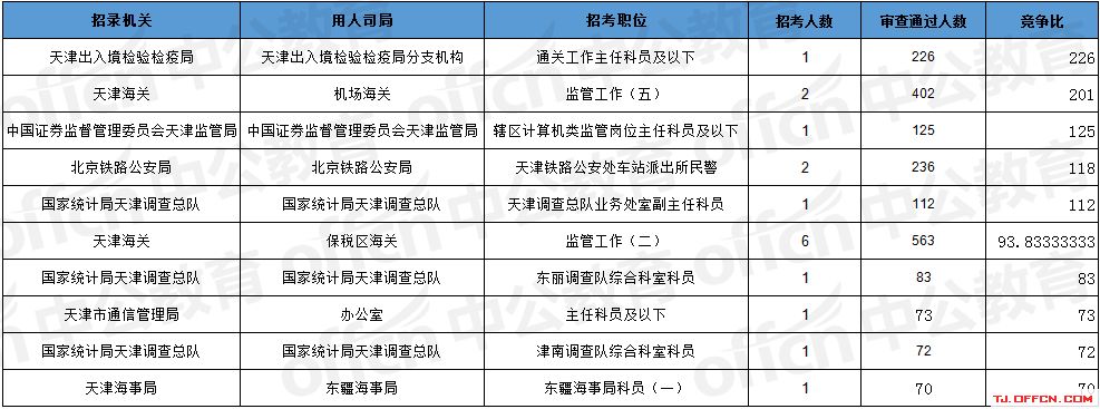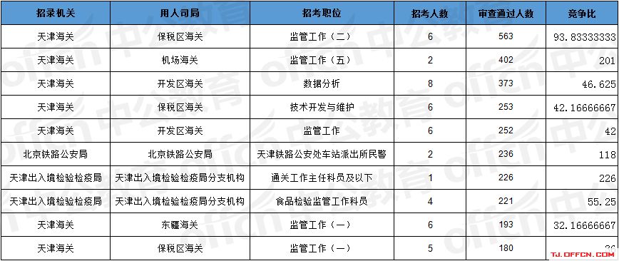 報(bào)名通過(guò)審核人數(shù)前十的職位主要集中在天津海關(guān)、北京鐵路公安局、天津出入境檢驗(yàn)檢疫局等部門,具體信息如下: