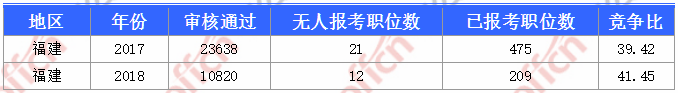 截至11月5日16時,據(jù)中公網(wǎng)校統(tǒng)計,國考職位中工作地點在福建的職位3009人待審,10820人通過審核,共報名13829人,其中有11個職位無人報名,平均競爭比例為41.45:1。