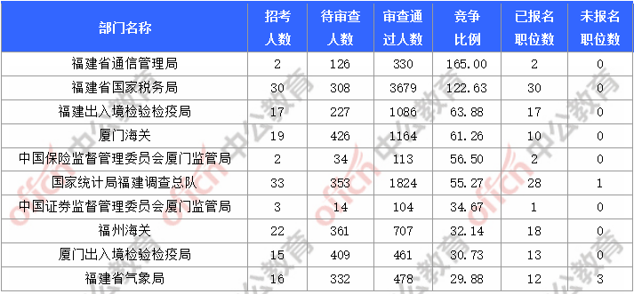 報名通過審核人數(shù)前十的職位主要集中在福建省國家稅務(wù)局、廈門海關(guān)、國家統(tǒng)計局福建調(diào)查總隊等部門,具體信息如下: