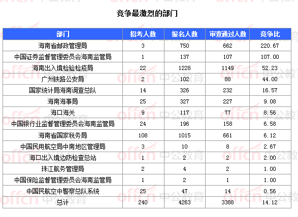 為幫助廣大考生更清晰的了解今日?qǐng)?bào)名情況,中公網(wǎng)校整理了審核通過(guò)人數(shù)的部門(mén)以及競(jìng)爭(zhēng)比例最激烈的部門(mén),供廣大考生參考: