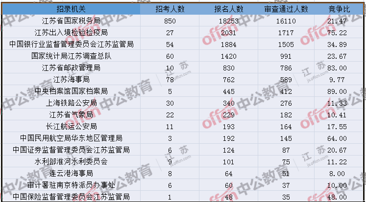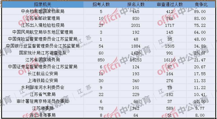 【11月5日16時】2018國考江蘇地區(qū)報名統(tǒng)計:23162人已過審,最熱職位385:1,仍有23個職位無人報考