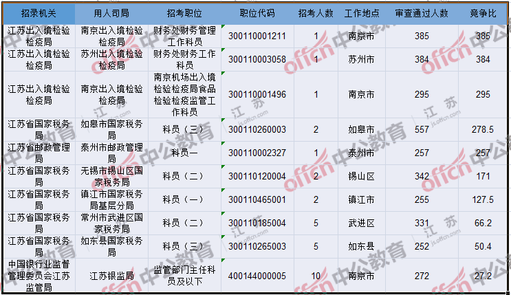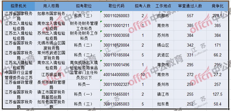 報名通過審核人數(shù)前十的職位主要集中在江蘇出入境檢驗檢疫局、江蘇省郵政管理局、江蘇省國家稅務(wù)局等部門,具體信息如下: