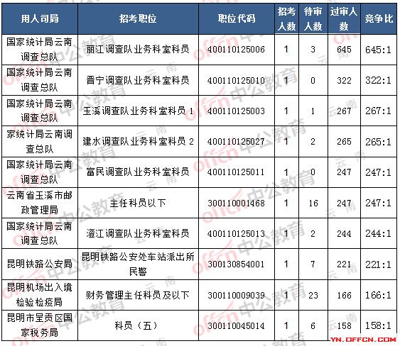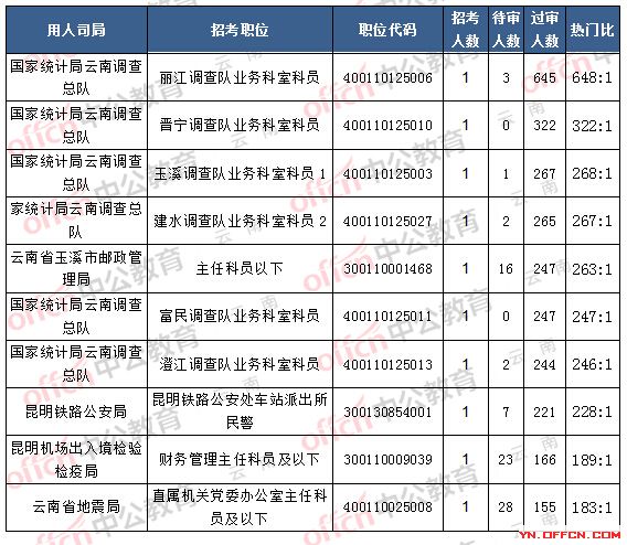 當(dāng)前最受歡迎的崗位是國(guó)家統(tǒng)計(jì)局云南調(diào)查總隊(duì),麗江調(diào)查隊(duì)業(yè)務(wù)科室科員,職位代碼:400110125006,招錄1人,648人報(bào)名,其中3人待審核通過(guò),詳情如下圖: