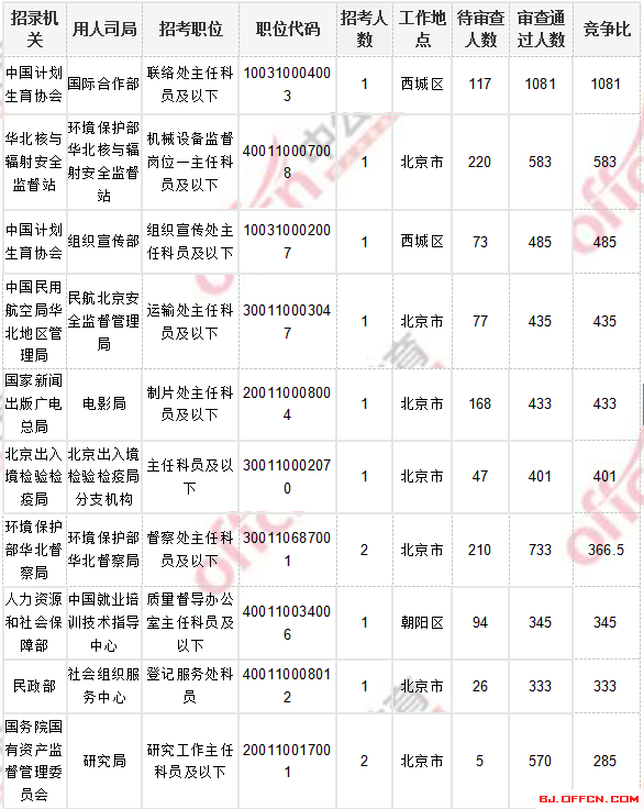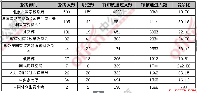 本次國考,北京國稅是北京地區(qū)招錄人數(shù)最多的部門,共招錄500人,目前審核通過的人數(shù)為9349人,待審核人數(shù)為4096,競(jìng)爭(zhēng)比為19:1,這也能看得出考生對(duì)于學(xué)生對(duì)于國稅的喜愛。在報(bào)名最多的10個(gè)部門中,由于大部分中央部門都在北京,所以這也是北京整體報(bào)考人數(shù)較多的原因。