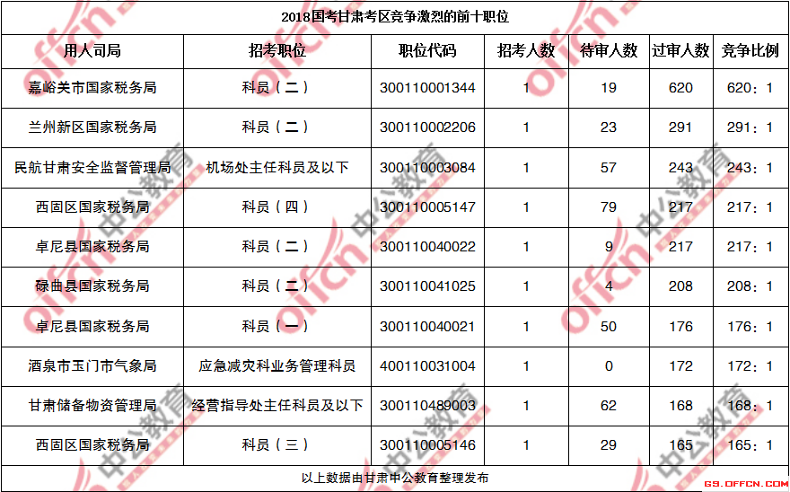 11月5日16時,競爭比例的職位為甘肅省國家稅務局嘉峪關市國家稅務局科員(二)一職,招錄1人,11月5日16時通過人數(shù)為620人,競爭比例為620:1!
