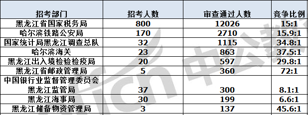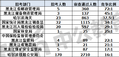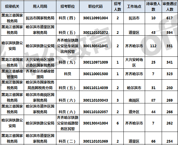 報(bào)名通過審核人數(shù)前十的職位主要集中在黑龍江省國家稅務(wù)局、哈爾濱鐵路公安局、黑龍江省郵政管理局等部門,具體信息如下: