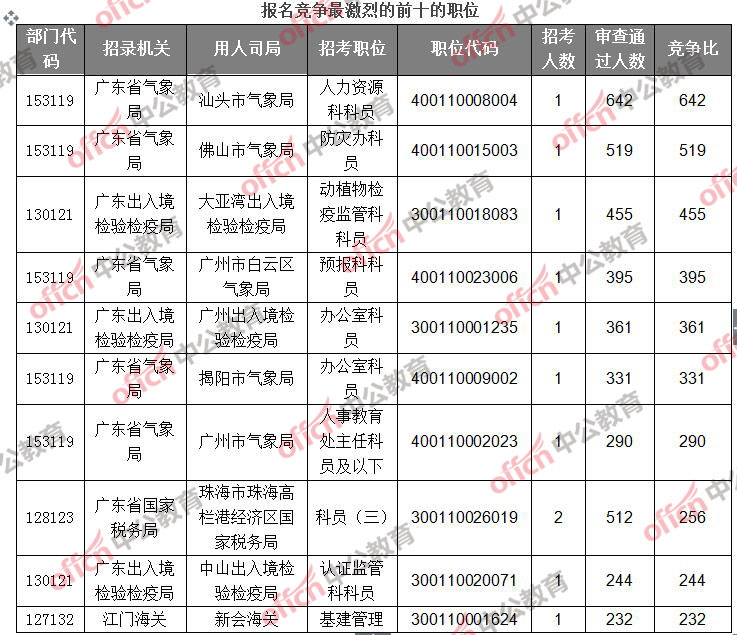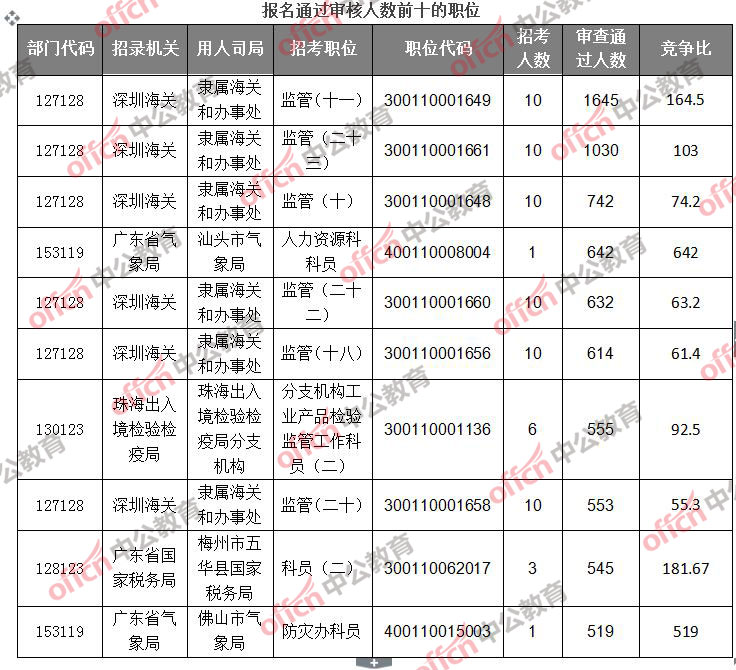 報名通過審核人數(shù)前十的職位主要集中在深圳海關、廣東省氣象局、廣東省國家稅務局等部門,具體信息如下: