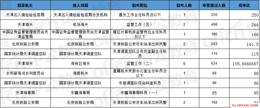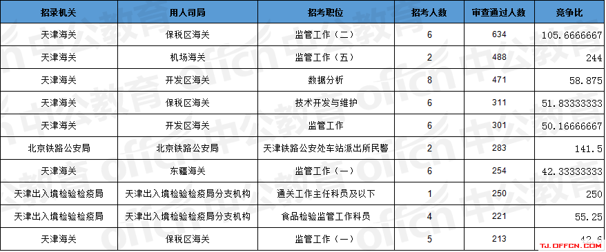 報(bào)名通過(guò)審核人數(shù)前十的職位主要集中在天津海關(guān)、北京鐵路公安局、天津出入境檢驗(yàn)檢疫局等部門(mén),具體信息如下: